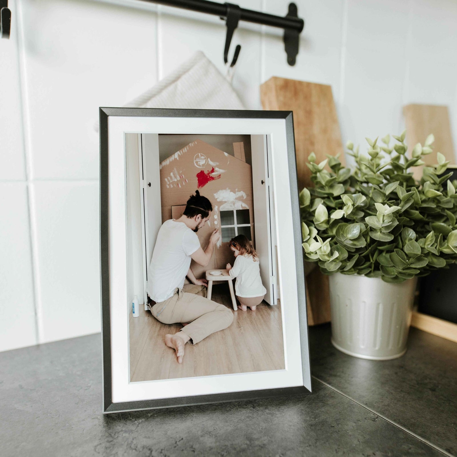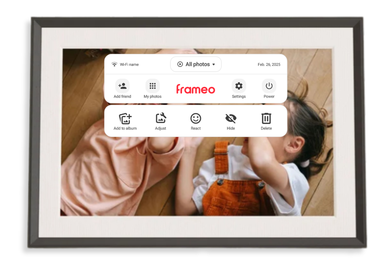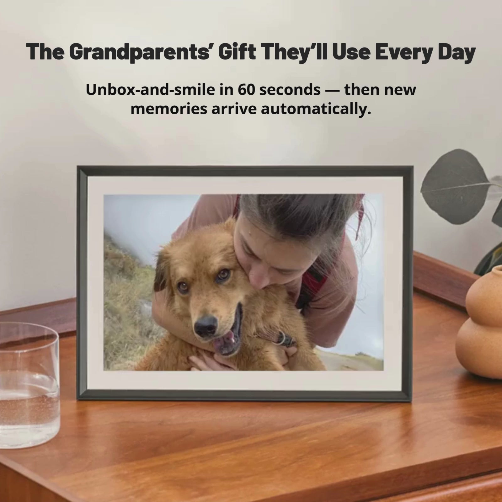 Plug in, connect Wi‑Fi, add 10 photos. Done. Even Grandma can do it.